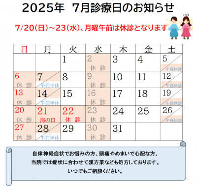 7月の休診のお知らせです。